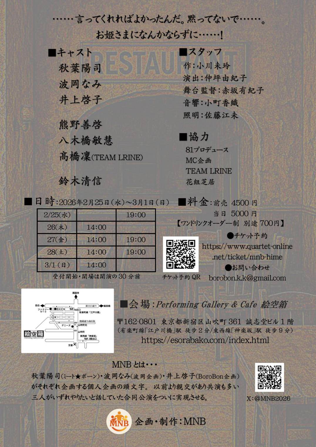 秋葉陽司が、MNB公演『お勝手の姫』に出演いたします。