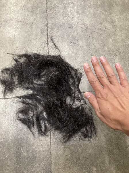 断髪式ばりに伸びた、髪切る前の写真と、切られた髪たち。